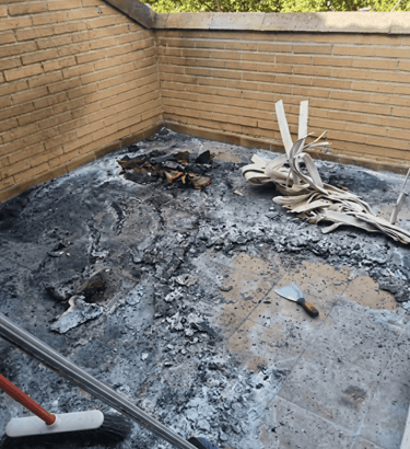 Esta terraza en un domicilio particular, sufrió un incendio, pero fue restaurada mediante una limpieza profunda y minuciosa hasta recuperar su aspecto original. El trabajo incluyó la eliminación de residuos, desinfección y tratamiento del pavimento para devolver al espacio su uso con total seguridad y tranquilidad.